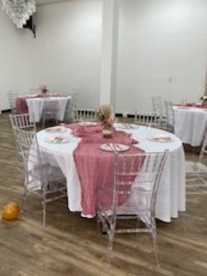 Furthermore, the space includes two Bluetooth speakers and an optional game room, which features arcade games and a 65-inch television with streaming capabilities and free wifi. The venue can accommodate up to 254 guests, with arrangements for seating and tables available. Specifically, we can provide 20 round tables, 10 rectangular tables, and 200 clear Chiavari chairs.